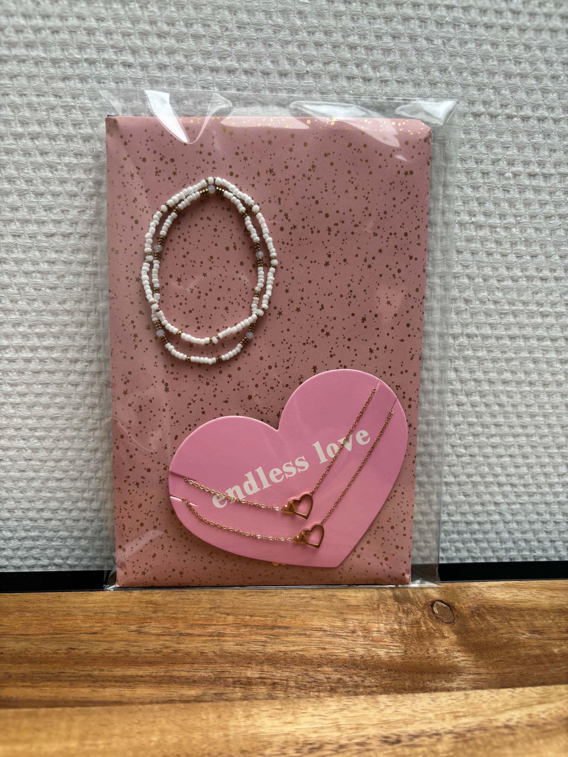 Super leuk cadeautje met 2 goudkleurige kettingen en 2 armbanden.