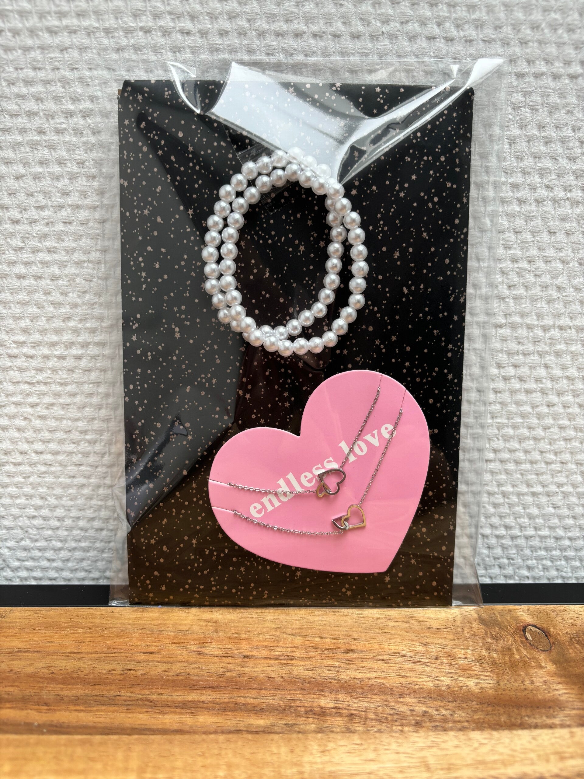 Super leuk cadeautje met 2 zilverkleurige kettingen en 2 armbanden.